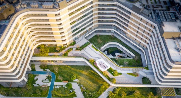 立体垂直的绿化空间和天井艺术中庭改善了场地风环境,调节了场地温度、湿度微气候,提升了空气质量的同时缓解城市雨洪,补充完善市政海绵系统。