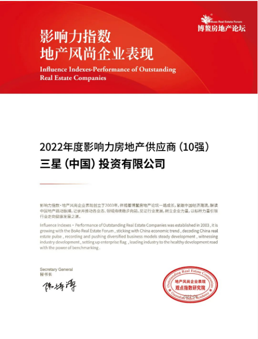 在“影响力指数·2022年度地产风尚企业表现”发布盛典上,三星中央空调凭借可靠、创新、高效的产品,满足地产行业合作伙伴不断涌现的新需求,解决用户痛点持续创新产品,获评“2022年度影响力房地产供应商十强”奖。