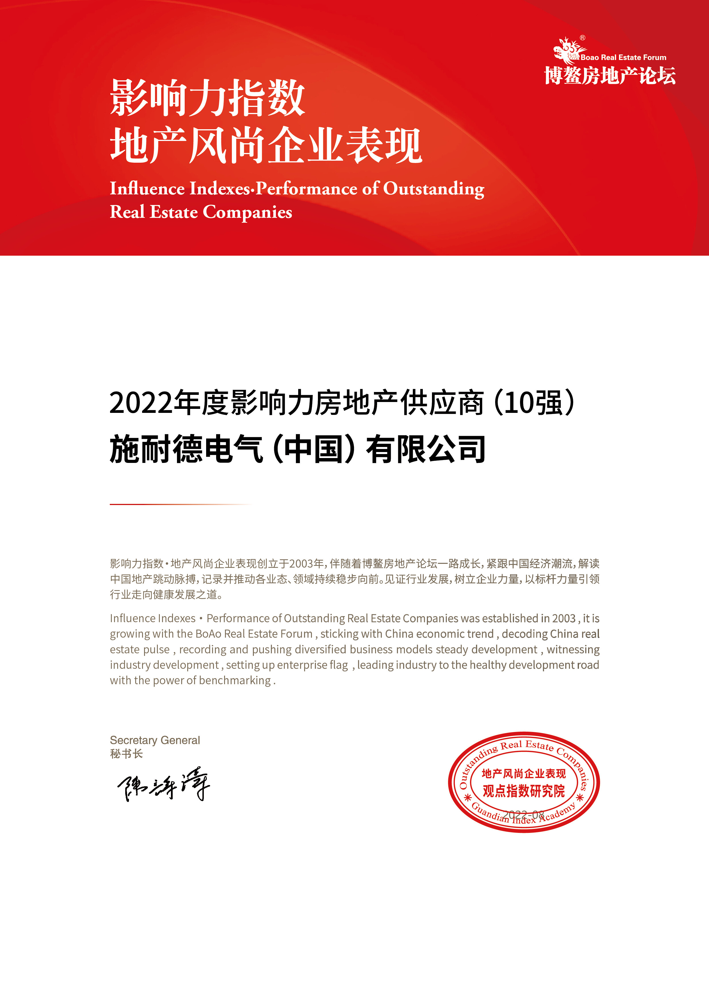 中国北京,2022年8月12日——日前,“影响力指数 • 2022年度地产风尚企业表现”研究结果在一年一度的博鳌房地产论坛上隆重发布。经过层层筛选与严谨评估,施耐德电气基于深厚的品牌影响力、坚持不懈的产品创新力和长期的优质服务力,再次荣获“2022年度影响力房地产供应商(10强)”这一殊荣。