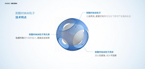 耐酷时技术,是一种将光触媒粒子封入到新型核壳结构中的新材料制造技术,通过该技术既保留了传统光触媒分解有机物的特性,又解决了由于“光触媒腐蚀”导致的光触媒粒子无法长期负载在有机载体的难题,从而极大地拓展了光触媒的安全性和使用范围。