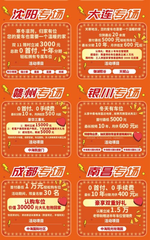 人求好房,车求靓位。在“双十一”即将到来之际,中海物业专业子公司深圳市优你家互联网科技有限公司(以下简称“优你家”)整合优质、稀缺车位资源,针对广州、呼和浩特、天津、长春、上海、无锡、苏州、佛山、沈阳、大连、赣州、银川、成都、南昌等地的中海社区开展“双十一车位节”,活动从11月11日—11月16日,活动期间推出最低0首付、分期轻松购、限时一口价、大额立减等多重优惠福利,真正做到让利业主客户,帮助业主给爱车挑选好车位,纵享更美好的社区生活体验。