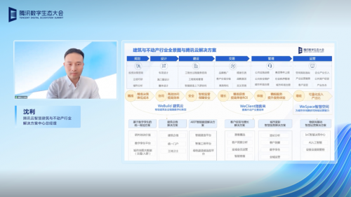 会上,腾讯云智慧建筑与不动产行业解决方案中心总经理沈利重磅发布了最新的智慧建筑与不动产行业解决方案全景图,其包括面向建筑建造行业的“WeBuild建筑云”、面向地产物业行业的“Wecliet微客来”、面向城市与片区更新行业的“WeSpace智慧空间”等三大解决方案,完整覆盖 “规划-设计-建设-管理-交易-运营”六大产业链环节,为行业全面数字化转型提供助力。