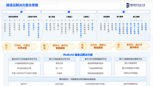 在建筑建造领域,腾讯云以“连接3亿产业从业人员”“先进的数字孪生和技术平台”为核心竞争力,推出了WeBuild建筑云解决方案。依托建企IDC、专区托管云、行业供应链/电商-区块链、建企信息数据安全等产品技术,WeBuild建筑云打造了建筑业“新基座”,并在此之上搭建融合BIM/CIM的数字孪生平台、基于企微的建企协同平台、基于AIOT的智能建造平台、基于大数据的建企数智中台等四大能力平台,助力建筑业全要素数字化提升,推进⾏业向⼯业化、绿⾊化、智能化转型升级。