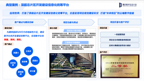 为了支撑“深超总”片区项目这一国际地标级建设项目的开发,实现数字化的预建、预判、预防,深湾发展通过引入腾讯WeBuild建筑云,完成了深超总片区开发建设信息化统筹平台的构建。基于WeBuild提供的数字孪生能力,该平台打造了规划设计展示、工程现状可视化两个核心模块,为深超总项目的规划和建设业务提供了重要支撑。据介绍,该统筹平台项目也荣获了2021年中国智慧城市先锋榜优秀案例的二等奖。