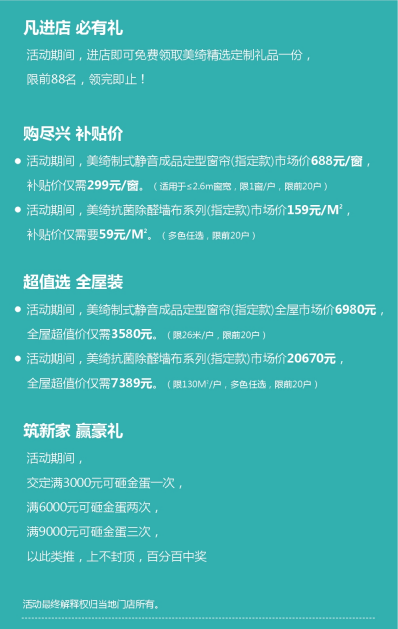 临近年关,大家今年的家装计划是否完成?年底焕新家的愿望能否实现?还没完成的小伙伴们有福了,美绮“理想家装节”年终钜惠来袭,错过再等一年,正在装修、打算换软装的伙伴不要再犹豫!11月24日——12月11日,美绮全屋墙布低至7389元,全屋窗帘低至3580元,全屋软装低至9999元,直播专享在线秒杀……活动期间还有超值活动权益卡可入手,9.9元抵200元超划算,还可以参与抽奖,中奖率100%!