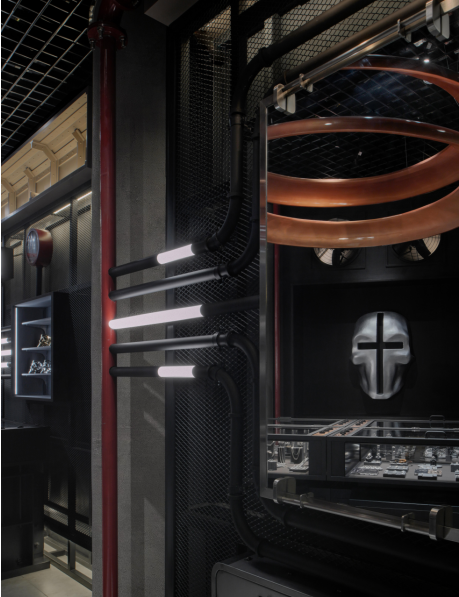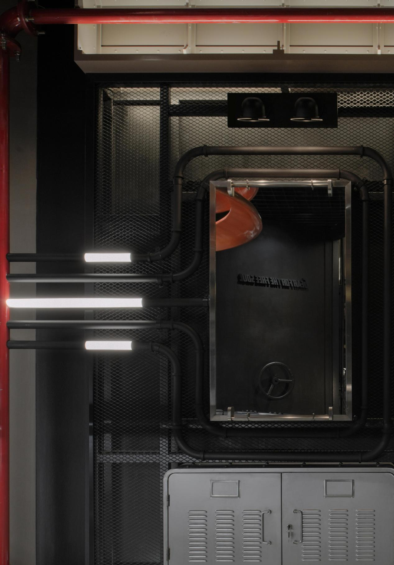 材质:空间中采用大量厚重质朴,且具有手工感的材料作为基底,铺陈出极富工业感的空间氛围,点缀暗合产品银色金属质感的不锈钢元素,与工业感形成平衡,并将产品本身的精致感体现在店铺中。穿梭于空间中的红色管道与原始场地里保留下来的水泥巨柱则是对激情和不羁的再一次表达。