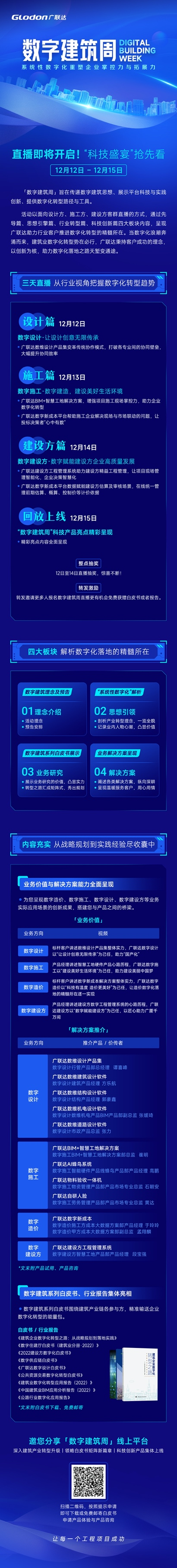 为此,广联达作为数字建筑平台服务商将在12月12日推出“数字建筑周”线上直播活动,面向设计方、施工方、建设方等,通过先导篇、思想引擎篇、行业转型篇、科技创新篇四大板块内容,呈现广联达助力行业客户推进数字化转型的精髓所在,传递数字建筑思想、展示平台科技与实践创新、提供数字化转型路径与工具。