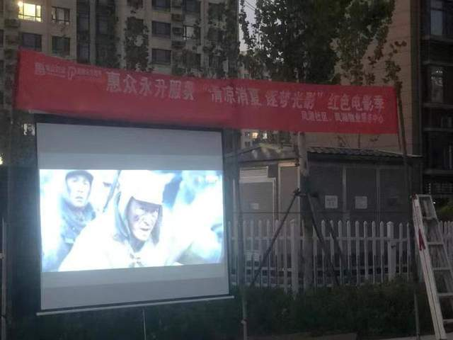 为大力弘扬爱国主义精神,激发居民爱国主义情怀,倡导爱国、爱党、爱家、友爱邻里的良好氛围,山东惠众永升物业管理有限公司滨北凤湖景城项目,在辖区广场上为居民放映红色电影《长津湖》。