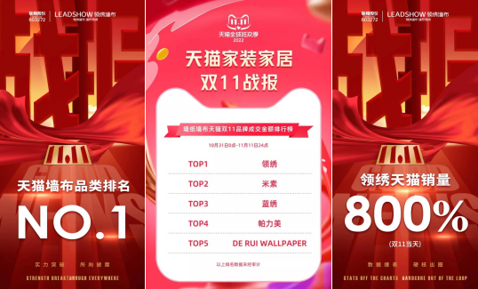 近两年,领绣墙布充分利用线上和线下的优势,使消费逐渐从“重商品数量”向“重消费体验”发展。在大家认为软装还属于“获客难、成交难、复购率低、需要眼见为实”的产品时,领绣墙布率先通过线上平台进行直播,推广、种草、带货。在2022年领绣双十一活动中,收获了天猫焕新装修榜榜一、天猫双十一墙纸墙布品类总销量第一、领绣天猫双十一当天销量同比增长800%、全网墙布品类曝光量第一等诸多成果。