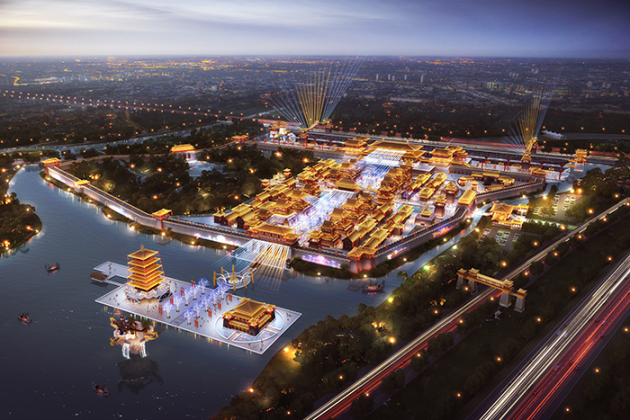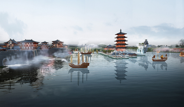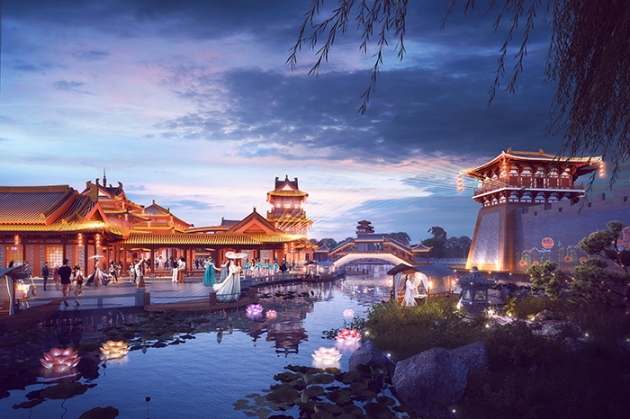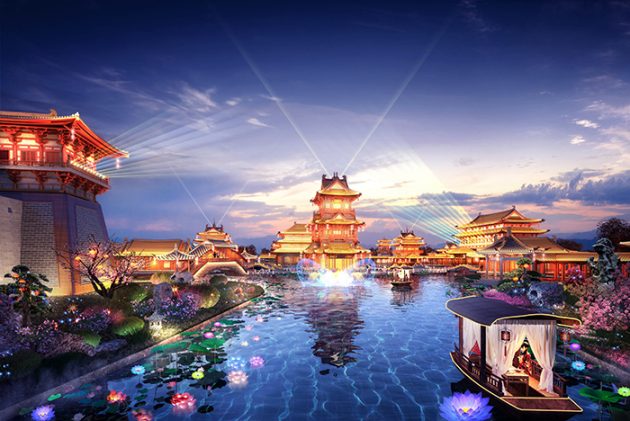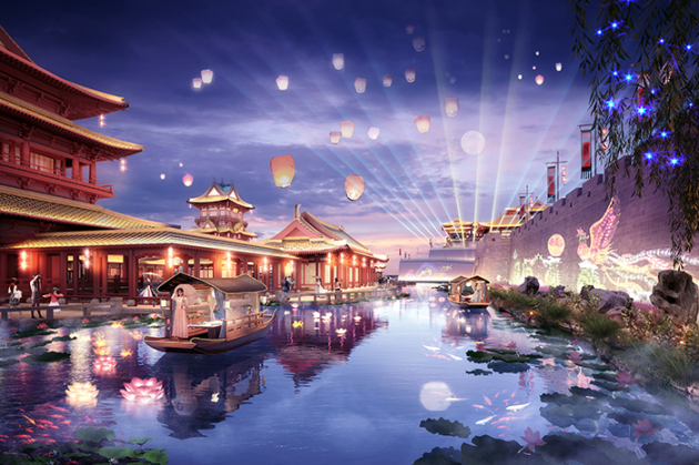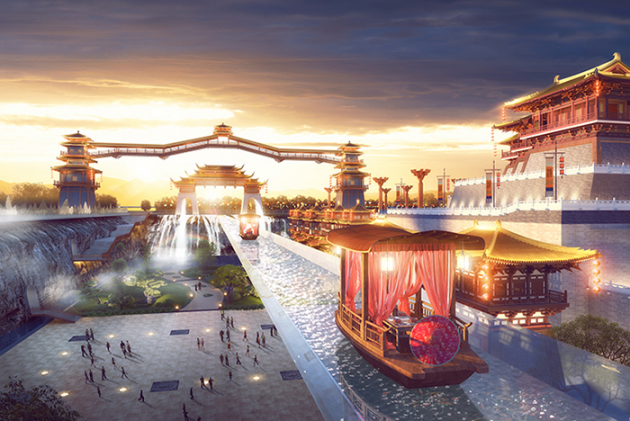 环绕在城市博物馆周边便是我们的倬彼云汉项目,其名取自《诗经》:“倬彼云汉,昭回于天。”汉同样于古代常见于《诗经》,指银河,也称云汉 、银汉、天汉,也泛指浩瀚星空或宇宙。沿着城墙边设置河道,其中养有观赏鱼类,于星河之上有船宴、画舫等等,河中灯光盈盈、光影婆娑,身处其中如深处浩瀚宇宙。于象征层面映射“楚河汉界”的典故,划分过去与现在,于心理层面给人一种越过天河进入汉代城池的穿越感。同样依靠倬彼云汉也依附有如画舫烟云、千年汴河、汉影云楼、浍水春生等表演项目。