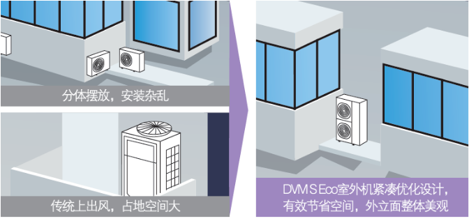 三星侧出风变频多联机有效减少占地面积, 7~14HP的大容量设备,比三星传统设备体积减少,摆放更加灵活,对于常用的4~6HP容量,设计三种不同高度的室外机产品,适配多种安装需求,840mm小巧身形,轻松置于飘窗下,四个不同方向的接管,便捷安装无压力。