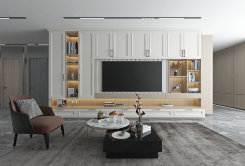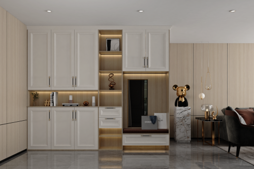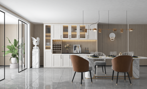 灯光也是欧式风格装修重要的一个元素,灯光颜色宜偏黄偏暗,可以营造温馨、舒适的感觉。海尔全屋家居H312系列采用秋韵白的门板色系搭配塔费拉榆木,内侧嵌入4000k灯光,还原木最本质的色彩,赋予空间静谧之美。