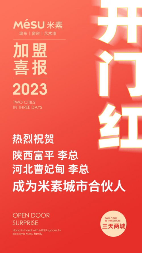 春回大地,万物复苏。春节后是各大品牌厂家打响新年第一炮的重要时机,在品牌资源投放与招商力度方面都会有所侧重,这对于创业者来说是一个不可多得的加盟良机,有远见的家居软装从业者会趁势把握机会,提前布局未来。作为行业头部品牌,米素软装铆足干劲吹响集结号,全力冲刺首季开门红,开业一周即有两家经销商加盟,分别是陕西富平李总和唐山曹妃甸李总,恭喜两位李总与米素成功牵手,未来紧密携手,共赴新征程!