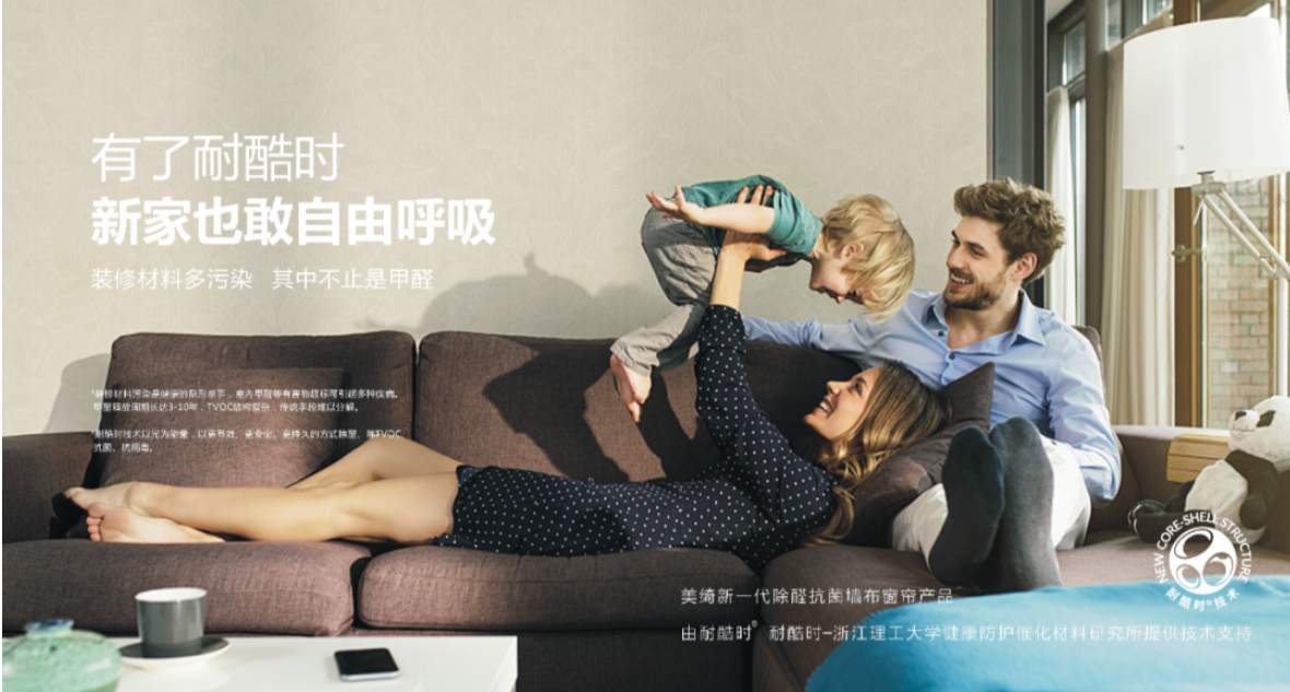 耐酷时技术作为一种新型核壳结构的光驱动材料制备技术,运用到美绮除醛抗菌墙布窗帘产品上,做到了集抗菌、抗病毒、除醛、除TVOC的四大功能,具备了长效、安全、环境友好的抗菌抗病毒等优异特性,形成了通过耐酷时技术赋能健康家装新生态的环保趋势。让消费者可以更安心便捷地入住新家,享受室内健康环境。