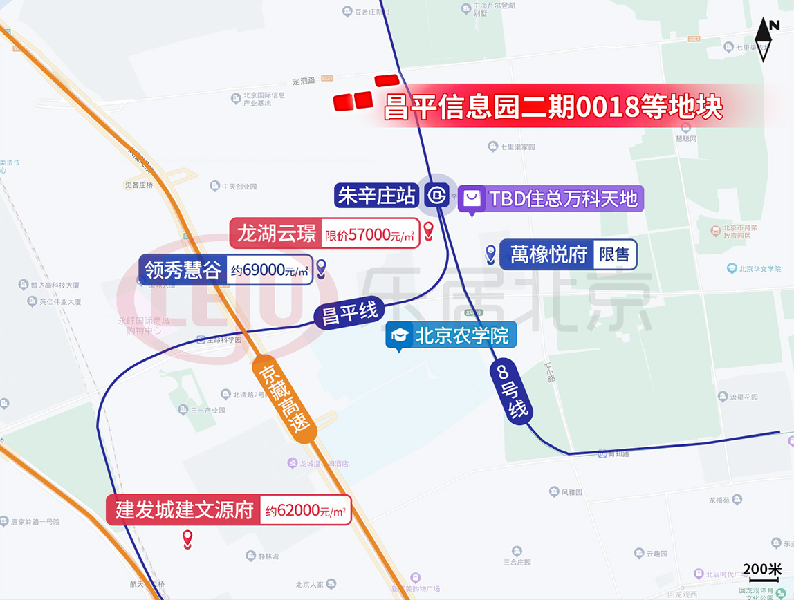 地块位置优势明显,交通便捷,西邻海淀(3.5公里),南邻朝阳(10公里),距离地铁朱辛庄站800米 (8号线与昌平线换乘站,1站可达生命科学园,2站可达中关村软件园)。配套方面,地块周边发展成熟,各类配套完善,商业配套量级较高。地块周边产业优势突出,汇集高精尖企业和人才,如中关村软件园讯、百度、新浪、网易、联想等科技企业、生命科学园(北大医疗、扬子江药业、国家蛋白质中心)、航天城(中国空间技术研究院)、永丰(大唐电信、用友)、翠湖科技园等,从业人员达百万量级,区域发展可期。