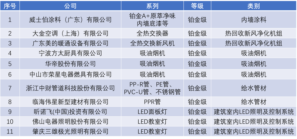 首批获得“健康建筑产品标识”的产品于2022年8月6日发布,来自大金空调(上海)有限公司、临海伟星新型建材有限公司、昕诺飞(中国)投资有限公司、广东美的暖通设备有限公司、宁波方太厨具有限公司等领先企业。