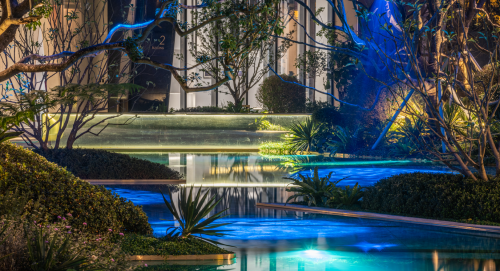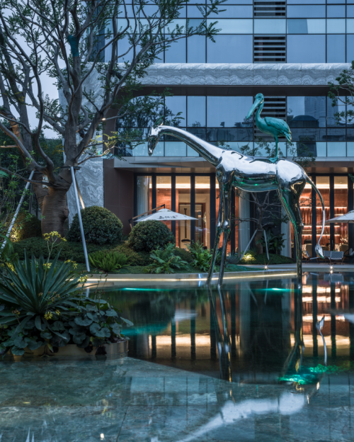 园林景观之中,将都市森林与城中谧静结合,在艺术家向京作品——《异境——白银时代》、《寂静成型》雕塑之下,塑造高低差、架空层,让庭院更具层次,并搭配艺术品陈设,通过绿植、水景、灯光等,为景观植入艺术基因,将艺术、生活、空间完美相融。