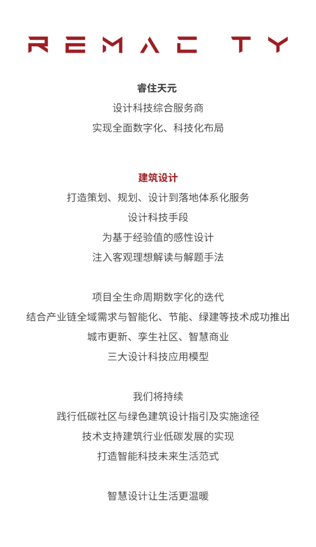 广东天元建筑设计有限公司(睿住天元)定位设计科技综合服务商,专注设计科技产业,打造建筑全生命周期数字化设计,具备全过程全专业设计咨询能力。联合英国皇家建筑师学会(RIBA)成立设计科技智库,与WATICA发起建筑科技创新全球倡议,聚焦数字化技术、人工智能、智能建造,技术支持建筑低碳发展,创造美好空间。