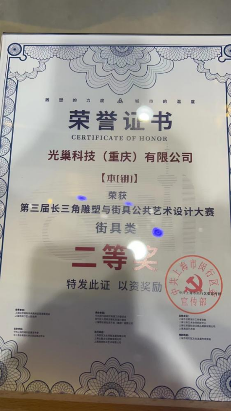 光巢科技(重庆)有限公司携优秀作品参赛,其中,作品【本[钥]】荣获长三角城市雕塑与街具公共艺术创意设计大赛街具类二等奖、光巢科技青年艺术家赖杰斌作品“上海之门”,荣获地标类二等奖。