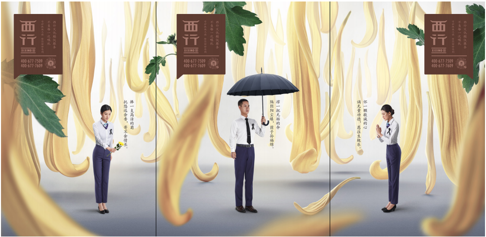 医护人员迎接着新生儿呱呱坠地,殡葬人员守护着逝者体面离开,都是哭声伴随着生命循环的过程。但前者众人都是喜气洋洋,后者则每个人都面露悲痛,甚至会夹伴着亲人之间的纷争,需要专业人员的陪同,才不至于让负面情绪过度蔓延。不同于简单的“陪伴”安抚情绪,西行文化则是提供全周期的电话咨询、全天候的管家式陪同、全流程的礼仪指导、全方位的礼宾协助、全区域的选墓指导的“陪办”服务。“陪办”包含“贴心陪同”和“暖心办理”两个含义,前者不顾风寒酷暑,第一时间赶到家属身边,抚慰生者情绪,让家属在面对繁杂且陌生的后事料理时做到心中不慌,事后回想起来也不会觉得哪里做得不舒服;而后者则是帮助家属避开暴利殡葬,从接到电话到整个治丧过程结束,包括从给逝者整理遗容、寄存遗体、办理手续、预定灵车、告别和火化,直到把骨灰交到家属手中或办理骨灰存放安置,在每一个环节做到礼数得当,顾全人情又不花冤枉钱。