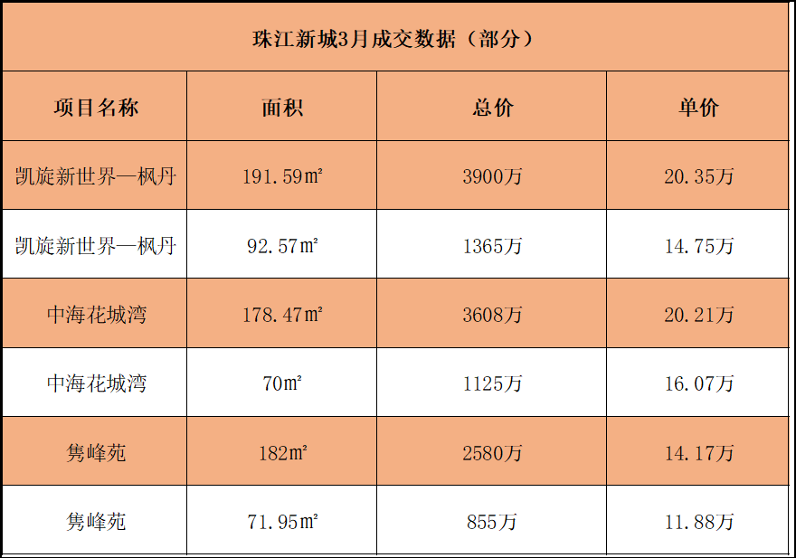 并且从投资的角度来讲,大户型有更高的溢价空间。参考珠江新城在3月份的成交中,以中海花城湾/凯旋新世界等标杆项目为例,大小户型价格差最高可去到近6万/㎡。