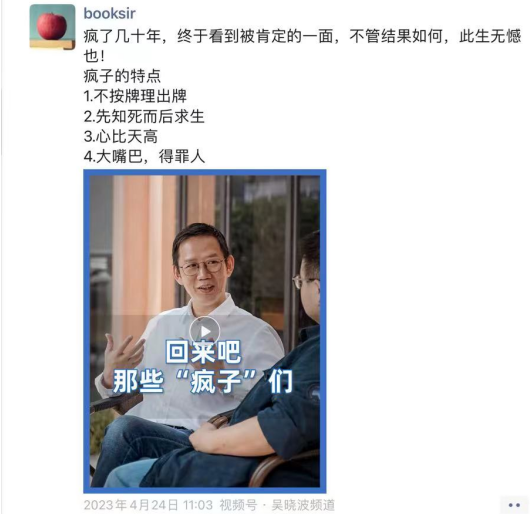 那天,有IT疯子之称、原258集团创始人、厦门书生庄良基在朋友圈分享了吴晓波一段视频《回来吧,“疯子”们》,并评论:疯了几十年,终于看到被肯定的一面,不管结果如何,此生无憾也!疯子的特点: