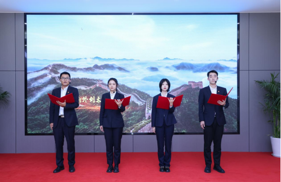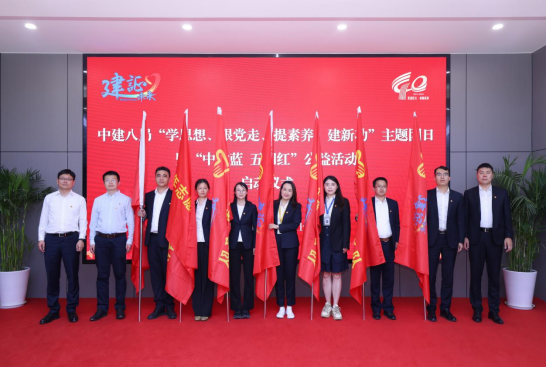 与会领导为中建八局青年志愿服务队授旗并启动“中建蓝 五四红”公益活动,各单位青年员工代表齐聚一堂,共同见证了振奋人心的授旗仪式。