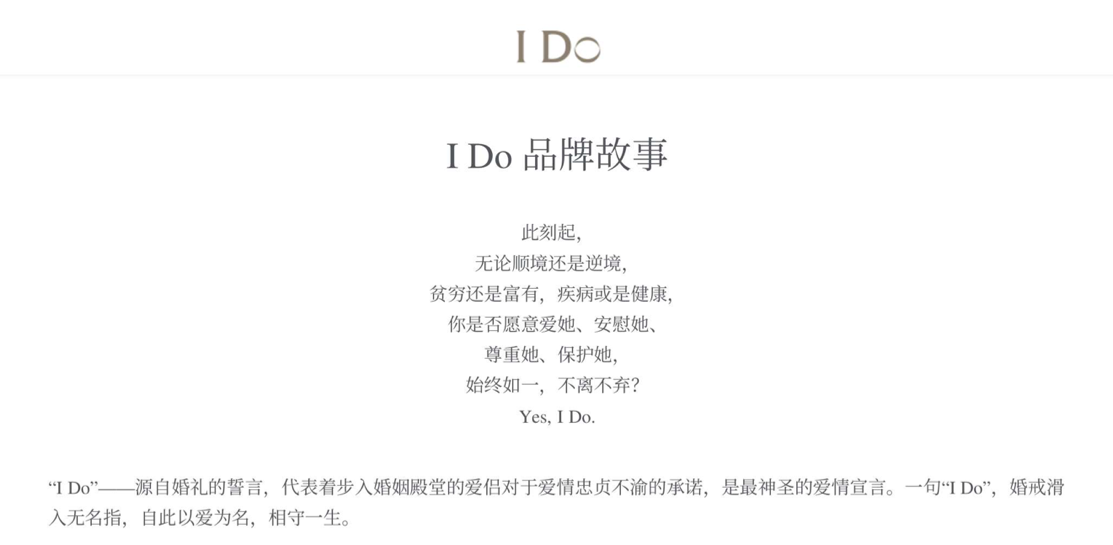 “‘I Do’——源自婚礼的誓言,代表着步入婚姻殿堂的爱侣对于爱情忠贞不渝的承诺,是最神圣的爱情宣言。一句‘I Do’,婚戒滑入无名指,自此以爱为名,相守一生。”这是I Do官网上的品牌故事介绍,但I Do老板本人的情感之路却与之大相径庭。