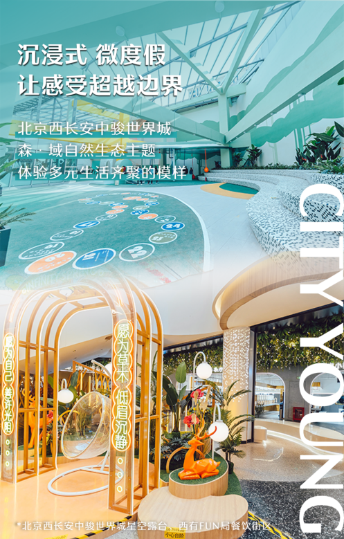 北京西长安中骏世界城在空间上主打“森·域”主题,在设计上、场景上、内容上多维度将商业空间与自然元素相交互融合,营造城市微度假与慢生活的氛围感。顾客可在绿植环绕的京西首个森域餐饮街区“西有FUN局”中品味网红热门美食,在威波豪斯冲浪俱乐部中感受户外冲浪刺激,在卡通尼儿童乐园里与孩子体验非洲的狂野,还可在5楼星空露台享受京西美景……