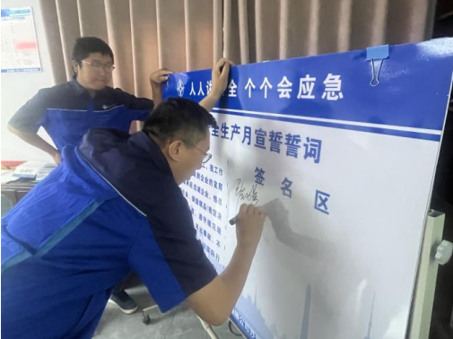 项目员工在“人人讲安全个个会应急”为主题的签字板上郑重地写上自己的名字,项目经理带头进行宣誓,表示对企业安全生产的承诺。