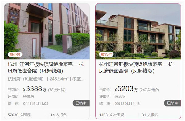 鉴于这套房源以超预期的价格成交后,不少杭凤府合院的业主都主动找到这个商家,委托其放到阿里资产上交易。2023年4月18日,第2套杭凤府合院房源上拍,起拍价只有688万,相当于市场价的2折左右。即使彼时处于二手房市场低迷期,仍然吸引了近6万人围观、14人报名、41次延时,最终以3388万元顺利交易。