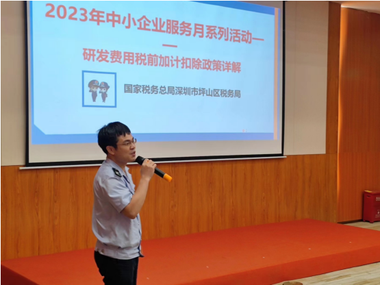 活动现场,深圳市企业所得税专业人才库专家刘汝君老师以《研发费用税前加计扣除政策详解》为主题,从科技型中小企业及各行业研发费用加计扣除政策、允许加计扣除的研发费用的自主研发项目及合作和集中研发项目等方面与在场嘉宾进行专业经验交流。