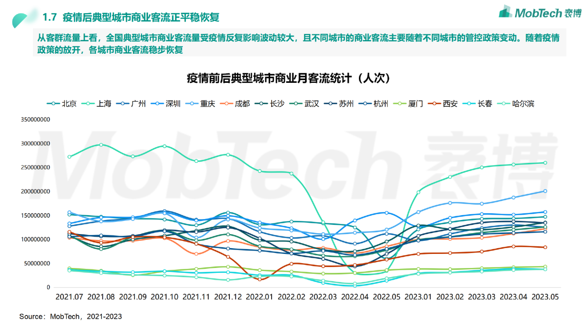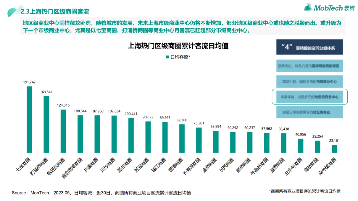 会上,专业的大数据研究咨询机构Mob研究院高级分析师周宇恒发布并解读了《2023年H1中国商业地产发展趋势及上海商圈客流报告》,报告从宏观经济、行业现状以及典型城市客流恢复等维度对2023年上半年商业地产行业进行了全景扫描,并选取典型城市上海的代表市、区级商圈和商业项目进行了切片研究。