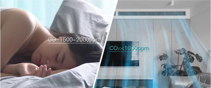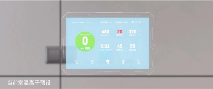 其核心工作原理,是通过新风空调一体机将室外的新风过滤掉PM10、PM2.5主要污染物后,向房间里输送鲜氧新风,再通过主机回风口,将房间里不再新鲜的空气(比如厨房烟气等)抽到室外。新风空调机的主要功能区ERV,可以有效的回收房间内的热度和湿度,再循环到房间内,从而实现恒温恒湿,且确保室内空气新鲜度,中绿东岳府配置的空气质量监测系统,可确保室内CO₂年均浓度≤1000ppm,最避免因CO₂数值超过1000ppm产生的沉闷、注意力不集中、心悸等情况的产生。