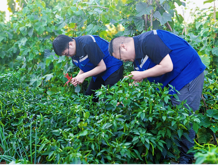 种下新的希冀,编制生活的小幸福,大家在工作之余锄草、浇水、搭架子,时常交流种植经验,用心用情种好自己的责任田。如今,小菜园早已硕果累累,经过厨师的烹饪端上了职工餐桌,品尝共同劳动创造的幸福果实,分享之后显得更加美味。“以后想吃什么,就去地里摘,纯天然无公害!”谈起责任田,大家都难掩喜爱之情,绿意盎然的田园风光也成为了项目一道亮丽的风景线。