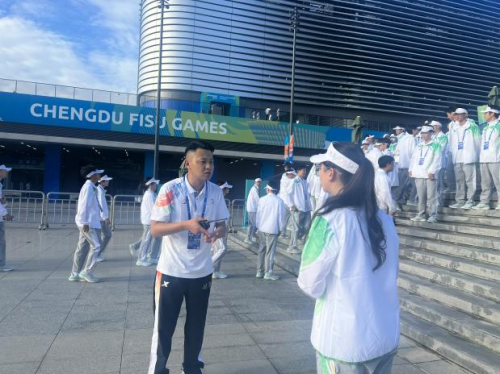 李元簇负责的是大运会开幕式客群组志愿者管理的工作,他所在客群小组共有800余名志愿者,有的负责场馆引导,要保证观众、运动员、赛事组通过各自通道有序快速到场;有的高举代表牌,将在开幕式上引导运动员方阵亮相登场。开幕式当天凌晨4点,李元簇已经在东安湖主体育场外严阵以待,为志愿者们发放统一服装,将志愿者们有序引入场馆内各个服务点位,他为志愿者们再三讲解引导路线,确保指引准确。体育场里每一条通道走向,都早已刻在李元簇脑海中,让他每一次指挥调度都游刃有余。