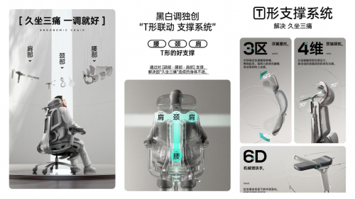 黑白调的T支撑系统不仅具有出色的人体工学设计,还带来了许多健康益处。针对人体久坐三痛问题提供了科学的解决方案。首先,T支撑系统能够有效解决长时间坐姿引起的腰部不适和疼痛问题,为用户提供良好的腰部支撑和保护。其次,T支撑系统还特别针对颈部问题推出了4维双轴颈枕,能够减轻颈椎的压力,缓解颈部疲劳和酸痛。此外,系统中的6D机械臂扶手可以调节多个方向,有效减轻肩膀的疲劳感,并提供舒适的承托支撑。