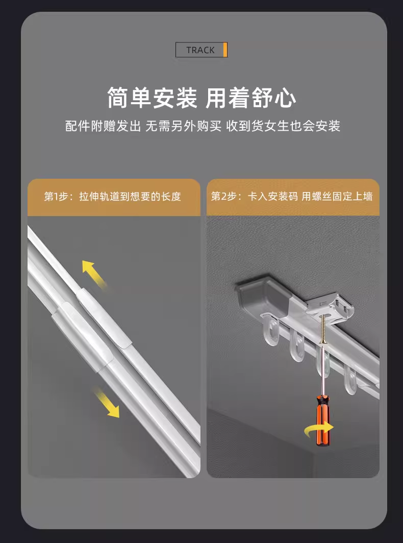 爱漫时研发的伸缩静音轨道,缩放自如告别测量困扰,让装窗帘变得更省力了,让小家装修布置变得更加省心,让家居浪漫氛围的营造也变得更加简单。