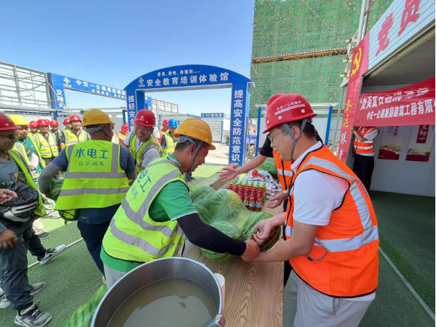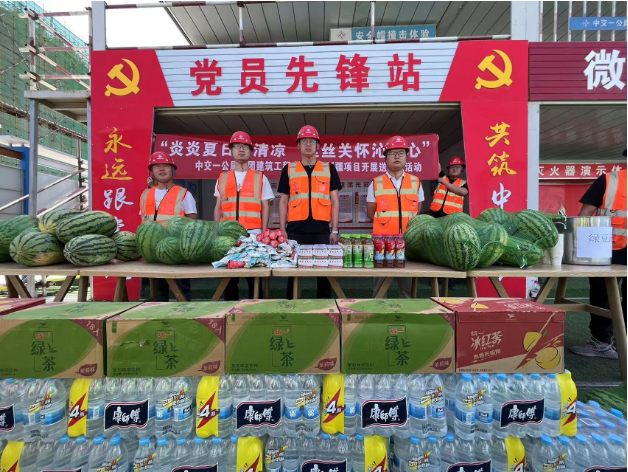 活动现场,该项目为近百名一线施工人员发放了西瓜、矿泉水、防暑药品等必要的防暑降温用品。同时,洒水车每天多次在工地上进行洒水降温作业。此外,也购置了一台冰柜长期供应冷饮“消暑”。