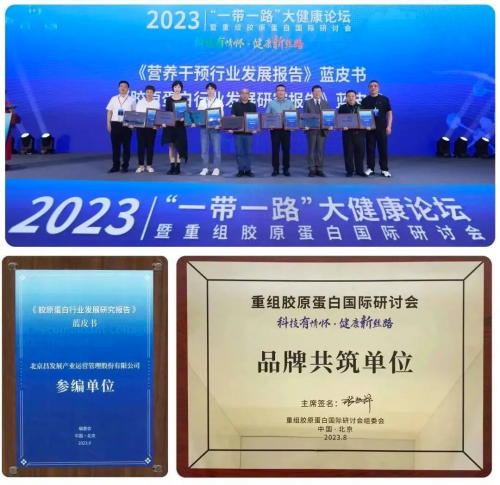 会上组委会重磅启动了《胶原蛋白行业发展研究报告》蓝皮书的编撰工作,以期为行业高速发展奠定坚实的基础。北京昌发展产业运营管理股份有限公司荣获“参编单位”证书及“品牌共筑单位”奖项。