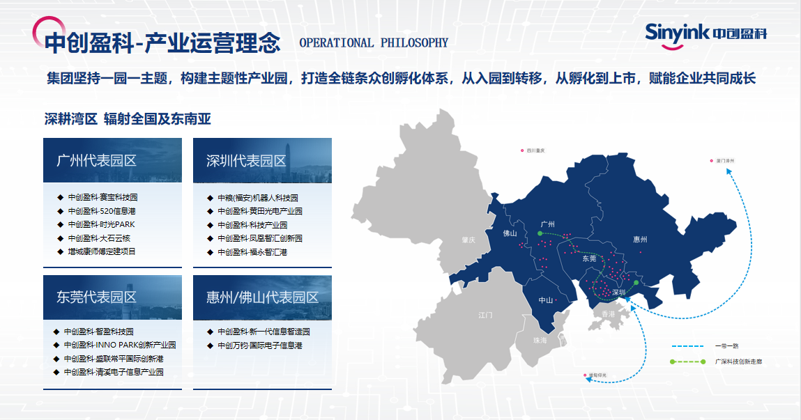 中创盈科自2008年成立之初,便紧跟战略性新兴产业、中国制造2035、粤港澳大湾区、一带一路等国家规划和国际倡议,将企业担当融于时代发展,以产业服务商的角色助力粤港澳大湾区产业升级。至今,中创盈科已成功落地逾60个园区,深度服务新一代电子信息、新能源、智能装备制造、5G通讯、机器人智造等主题化产业,多个园区荣膺国家级、省市级奖项,在粤港澳大湾区产业转型升级进程中发挥重要空间载体作用,并逐步成长为区域具影响力的产业服务品牌之一。