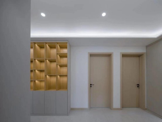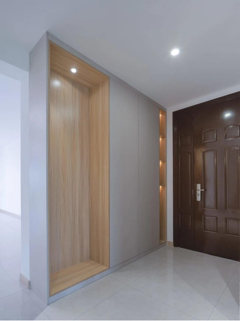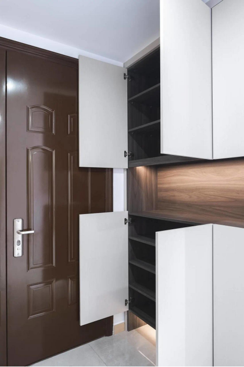 玄关处通过合理的收纳布局,不仅满足了多人口的使用需求,也形成了洁净区,将室内外隔离,形成过渡区域。