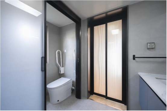 适老化设计在整个项目中有着诸多应用,走廊、门洞等合理的尺度设计,考虑到轮椅的便捷通行,在卫生间等空间里的无障碍设施设计,以及老人助力设备,都保障了老人的居住安全性。