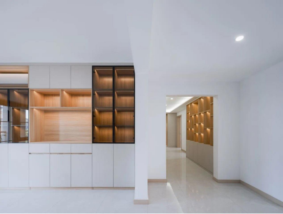 收纳四:走廊尽头矮柜改高柜,可存放尺寸较大的书画作品,可以满足业主书画展示的需求。