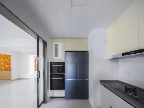 将设备隐藏,通过大小不一的收纳排列,形成视觉美感,也为餐厨区提供了生活秩序感,就近收纳原则也缩短了家务动线,使家务整理不再成为负担。