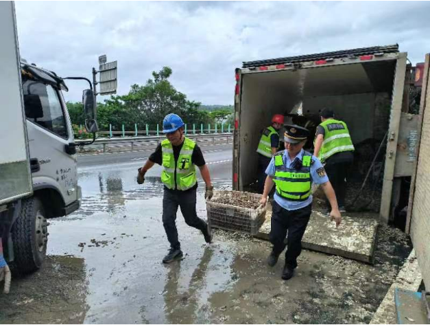 救援人员到场后,发现事故车厢体已破损、破了一个大洞,现场撒落着一大片的海蛏;现场人员进行安全布控后,随即利用竹扫帚、铁锹等随车工具先行归集起来,避免被过往车辆碾压。货主紧急安排的盘货车到达后,现场人员又投入到帮忙重新装筐及转运中。因车辆侧翻后,原本整整齐齐的一筐筐海蛏,全都倾倒在车厢内,由于海蛏壳薄且价值相对较高,加上断断续续的降雨,给清理工作带来极大的难度,盘货运载2辆车后,最终直至10点多才转运完毕、拖离事故车辆、现场清理干净,高速公路管理部门尽最大努力挽回驾驶员经济损失。