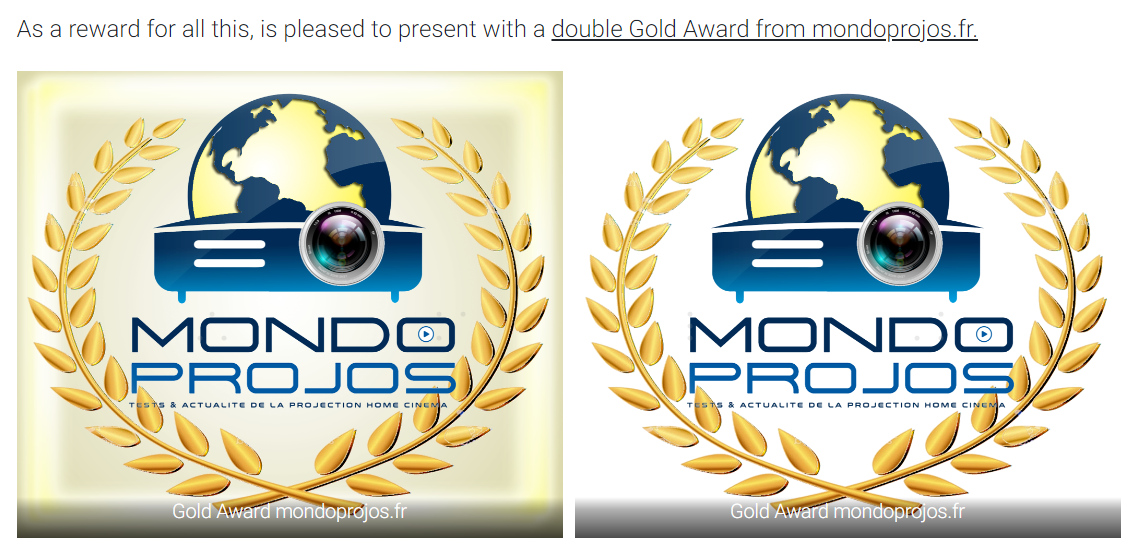 近日,海信4K激光投影C1 PRO凭借优秀的画质、便捷的自动校正技术,以及时尚的外观设计,被法国权威评测媒体mondoprojos授予“双金奖”荣誉。