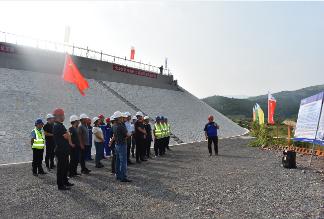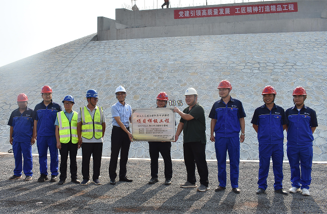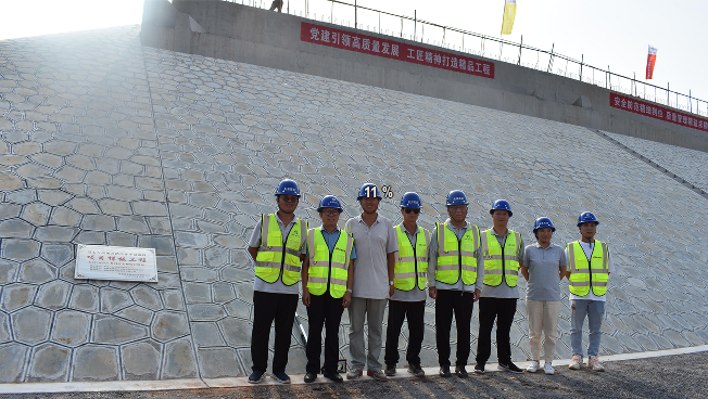 活动中,在场党员干部一起参观了龙门河桥台锥坡及周边防护施工现场,实测实量了锥坡坡度、平整度等关键数据指标,对成品的外观质量效果给予充分肯定。乔文王感谢项目公司党支部和总监办党支部的全程大力支持和正确指导,向在场党员干部介绍了项目的创优方案和样板创建目标,分享了该样板工程创建历程中党支部围绕“中交蓝·党旗红·党建引领高质量建设”宗旨,积极探索“党建+安全”“党建+质量”“党建+生产”新路径,将党建融入安全、质量、和生产经营全过程,并为此成立了质量创优党员先锋队,在施工一线划分党员责任区和设置党员先锋岗,实行党员领导认领和包保责任制,发挥党员领跑作用,开展党建精益质量、助力生产活动,为样板创建筑牢基础,以及在各方面取得的扎实成绩。