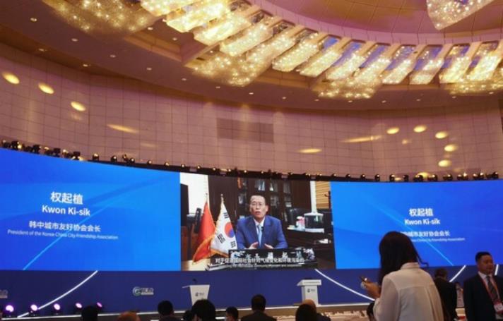 韩网讯/韩中城市友好协会会长权起植3日在中国山西省省会太原晋阳湖国际会展中心举行的"2021桃园能源低碳发展论坛"上发表了视频贺词。