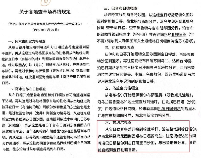 侯志平的无罪辩护,始终锚定在一份不容置疑的权属基础上。1992年,阿木古郎宝力格苏木第九届人民代表大会二次会议通过了《关于各嘎查草场界线规定》,清晰划定了甘珠尔嘎查的草场范围;1997年,旗政府为该嘎查颁发草原所有权证,边界坐标与文字描述明确,且与相邻嘎查权属证明无冲突,此后二十余年未发生权属争议。